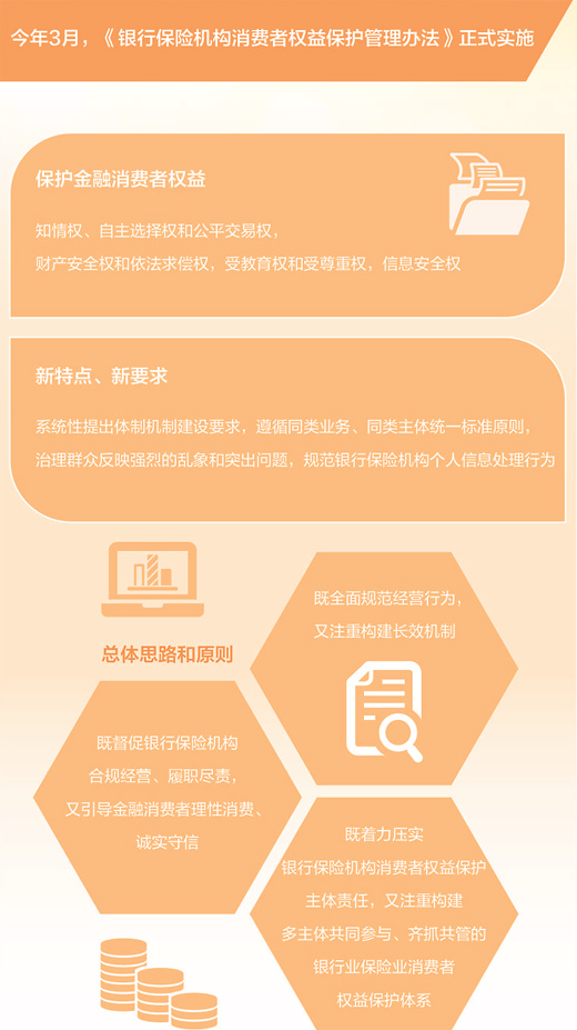 今年3月,《银行保险机构消费者权益保护管理办法》(以下简称《管理办法》)正式实施。对消费者反映强烈的问题,《管理办法》提出针对性要求。例如,明确银行保险机构应当以显著方式向消费者披露产品和服务的性质、利息、收益、费用、费率、主要风险、违约责任、免责条款等可能影响消费者重大决策的关键信息;不得进行欺诈、隐瞒或者误导性的宣传,不得作夸大产品收益或者服务权益、掩饰产品风险等虚假或者引人误解的宣传等。针对“理赔难”,规定不得拖延理赔、无理拒赔。