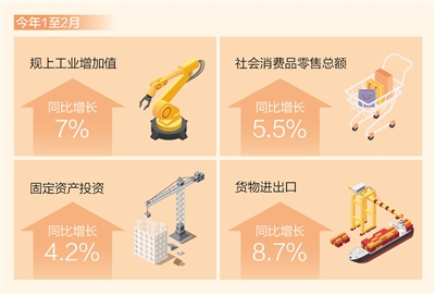 新动能新优势不断培育。高技术产业发展向好,1至2月,规模以上高技术制造业增加值同比增长7.5%,比上年12月加快1.1个百分点。1至2月,高技术产业投资和制造业技术改造投资同比分别增长9.4%和15.1%,保持较快增速。新业态继续活跃。1至2月,实物商品网上零售额同比增长14.4%,比上年全年加快6个百分点。