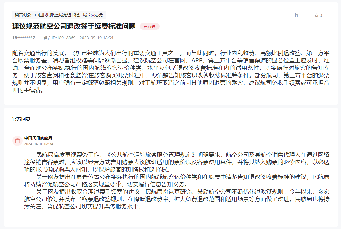 关于网友提出收取合理退票手续费的建议,民航局指出,将认真研究,鼓励航空公司不断优化退改签规则。民航局回复称,今年以来,多家航空公司修订并发布了客票退改签规则,在降低退改费率、扩大免费退改范围和适用场景等方面做了改进,民航局也将持续关注,督促航空公司切实提升票务服务水平。